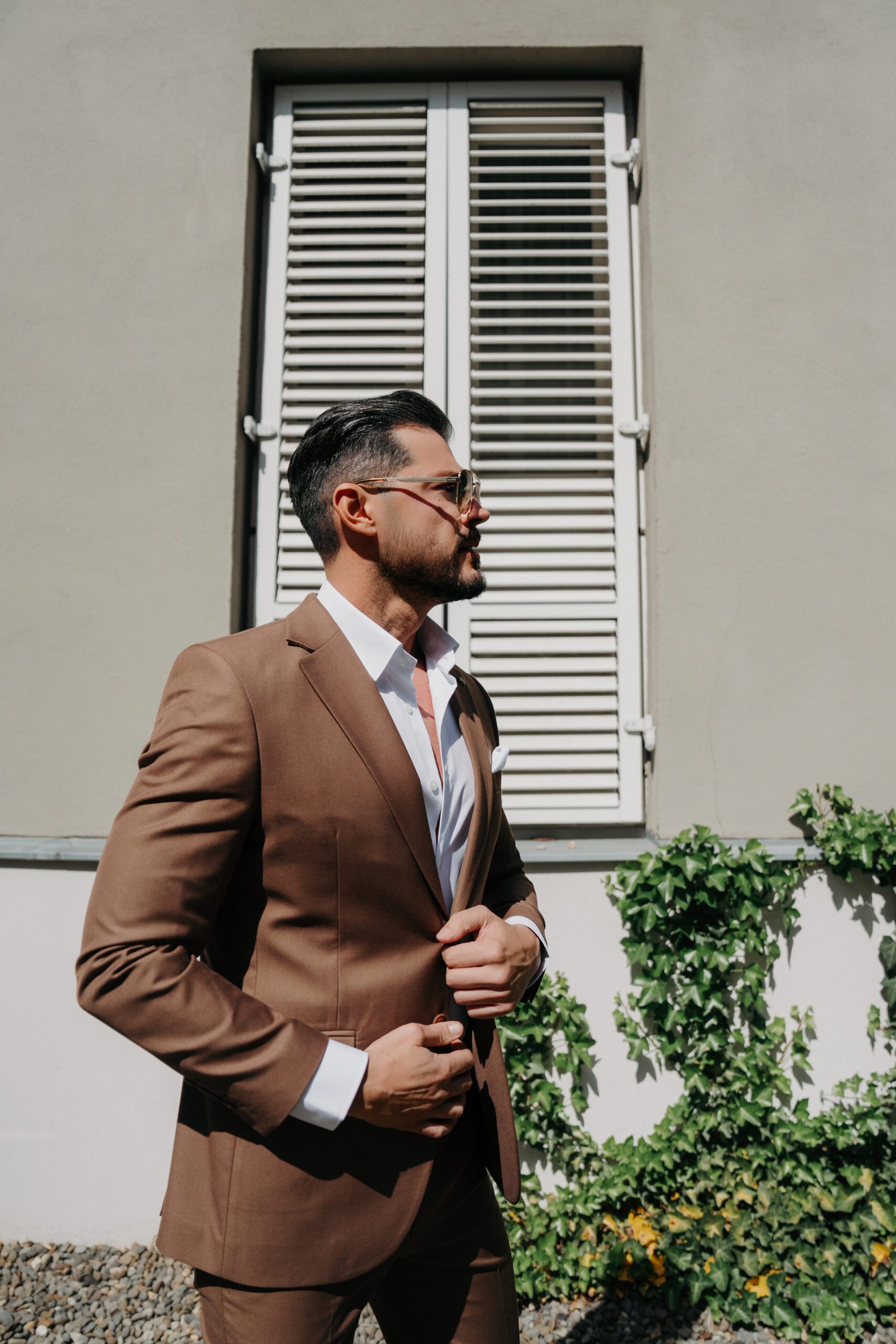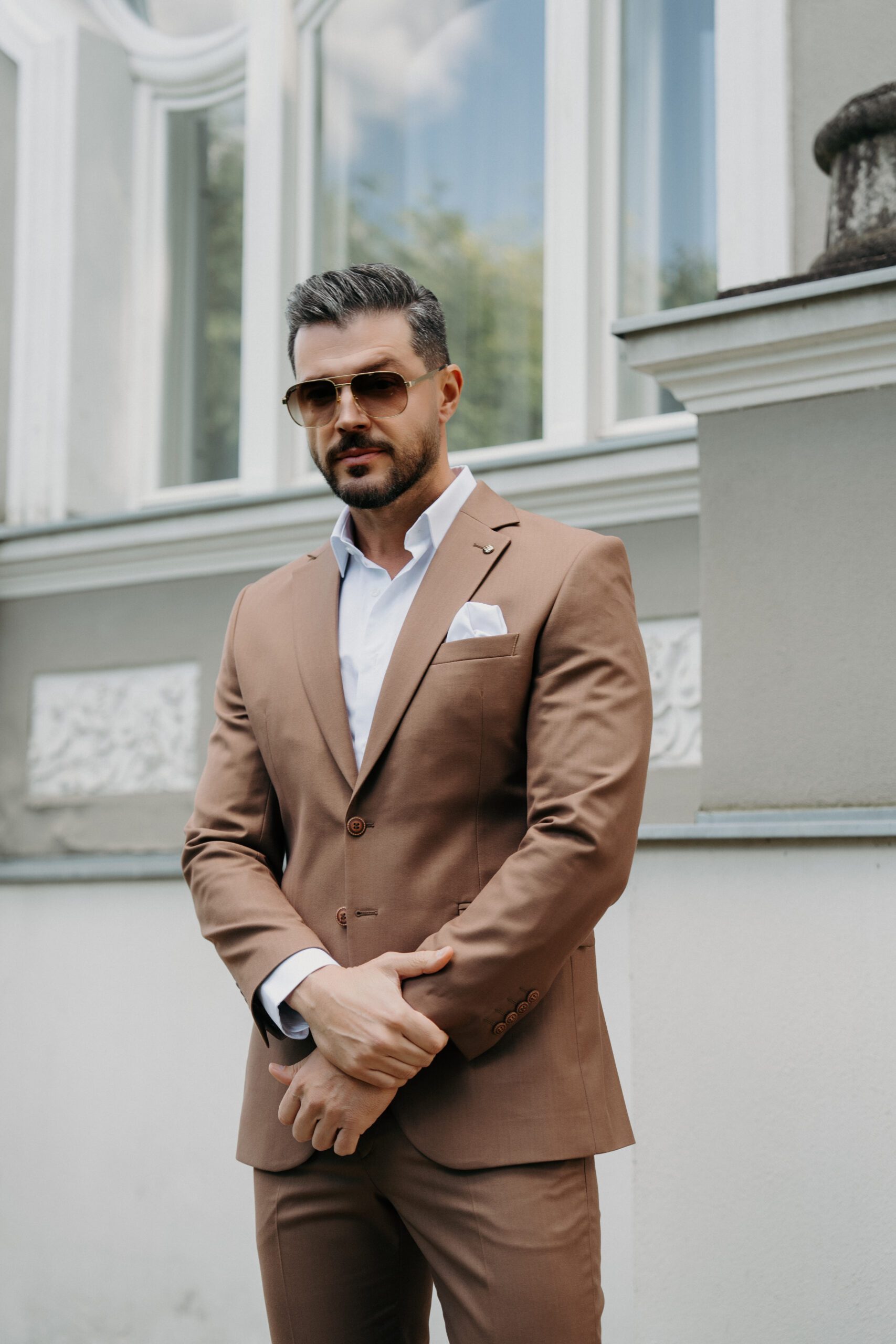 Un costum definit de o nuanță caldă și sofisticată de maro, perfect pentru bărbații care apreciază eleganța rafinată. Versatil și impecabil, este ideal pentru evenimente de zi, întâlniri de afaceri sau ocazii speciale când vrei o prezență distinsă. Materialul este 80% lână și 20% poliester.